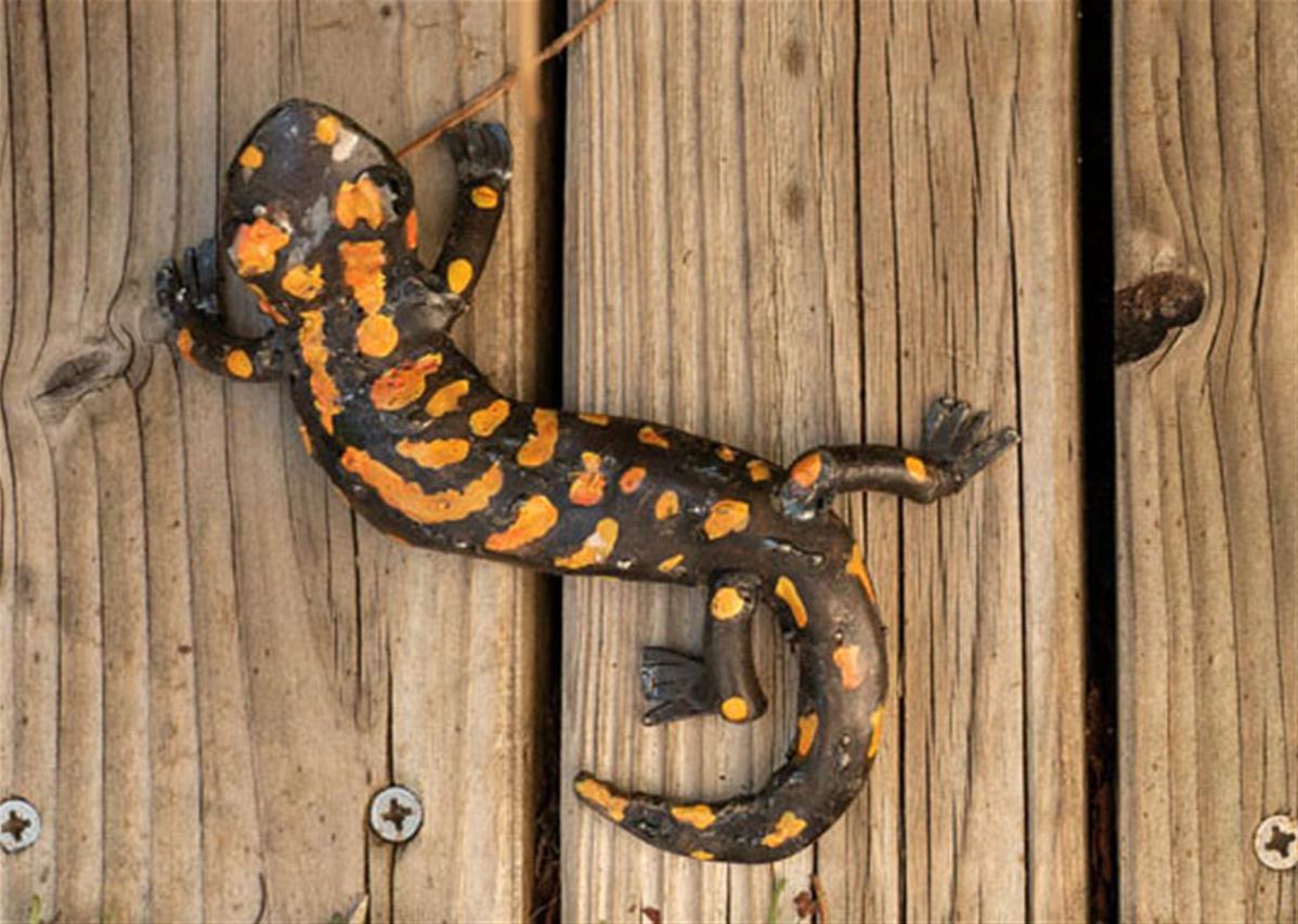 Salamandre tachetée ondulée en métal recyclé.